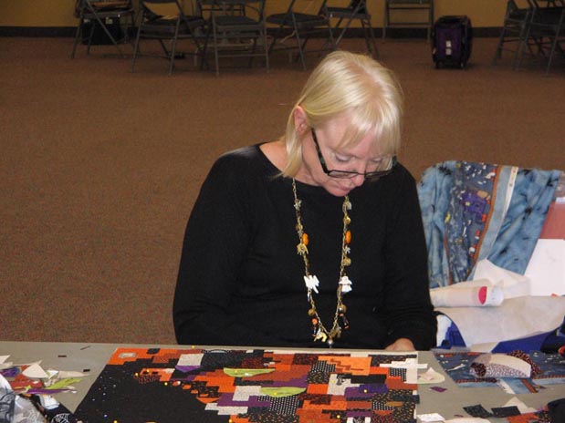 Valerie pondering fabric selection and placement